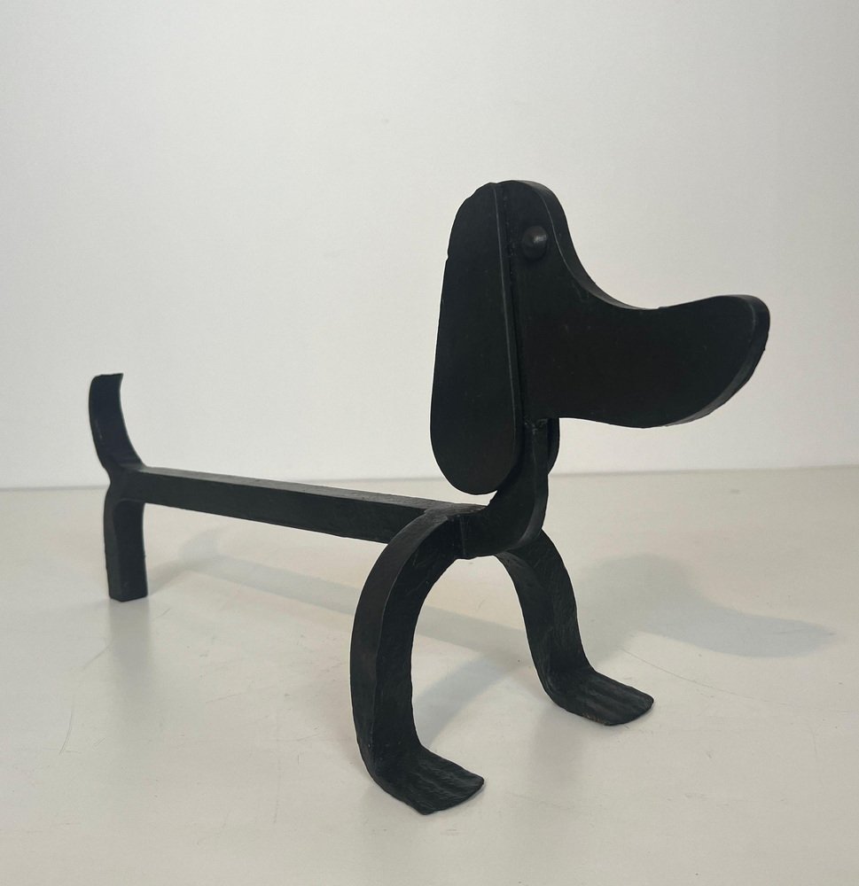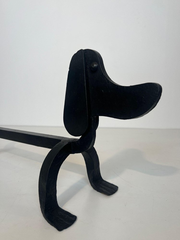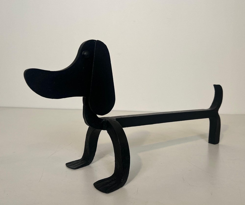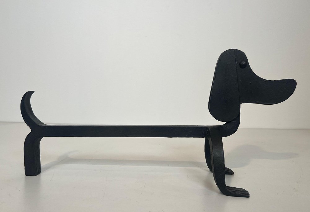Wrought Iron Chenets Representing Dachshunds attributed to Edouard Schenck, Set of 2